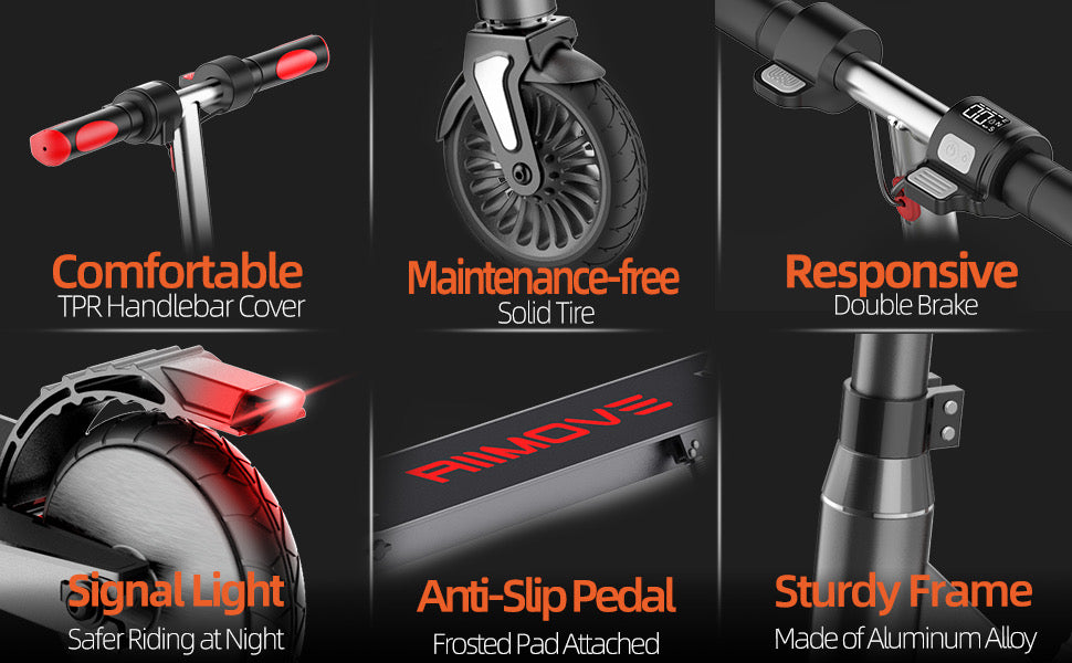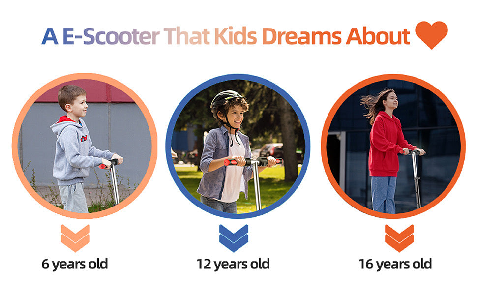 SAFETY & HIGH QUALITY - Kids electric scooter with an electronic throttle its variable speed, and easy full stop by responsive Dual Braking Systems (electronic brake and rear foot brake), Specially equipped with Non-Zero start tech to prevent accidental start. Electric scooter for kids ages 8-18, made of High-Strength aluminum alloy, with 5.5" solid tire can easily cross all kinds of roads without "puncture".