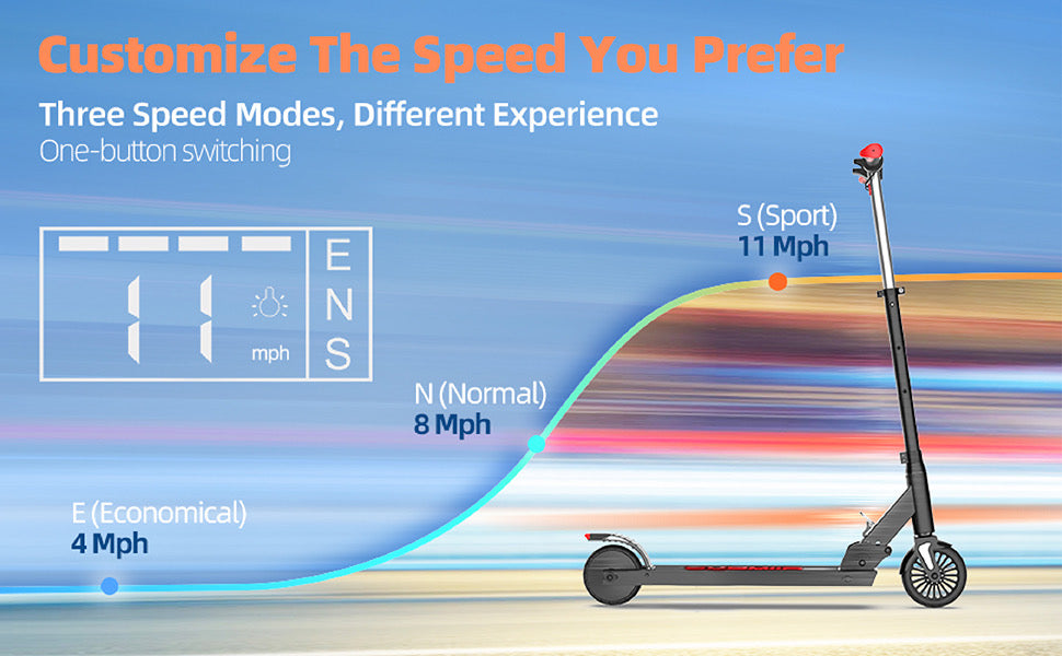 3 DIFFERENT SPEEDS - Our electric scooter with LCD Display, get real-time power, speed, mode easily, also the power button is right up top for easy operation. 3 different speeds (4 mph/8 mph/11 mph) can be switched by pressing the power button, set the different speed depending on age and gain in skill-level to get fun and exact safety.
