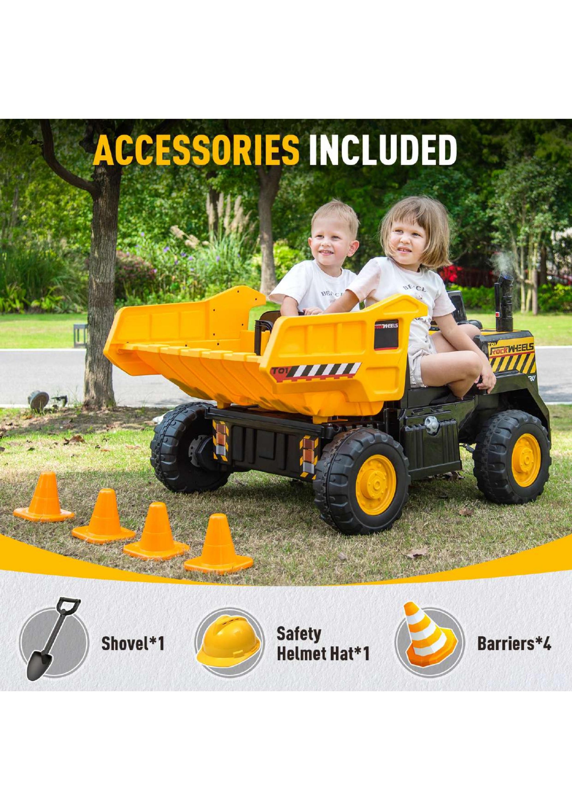 - 【Multifunctional 24v Ride On Dump Truck - Interactive Features】This 24v kids construction vehicle is equipped with an big electric auto-lifting dump bed. Kids can use a toggle switch to control the dump. The complimentary helmet, shovel, and traffic cone. Kids can use additional shovel traffic cones to load snow, leaves, or sand onto the dump truck. It is also equipped with a spray chimney with independent operation. As long as water is added, the spray will be sprayed out. Real engine sound simulator with real engine sound, allowing children to play in an immersive way.